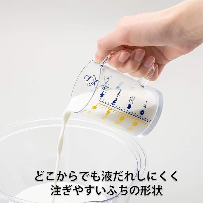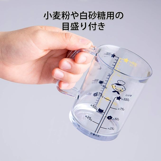 しっかり握れる大きめハンドルの計量カップ こどもにも分かりやすいよう目盛りごとにモチーフ付きで親も指示がしやすい