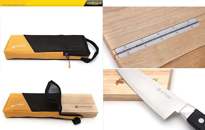 ★メッシュ式の専用収納袋が付いており濡れたままでも収納が出来ます。またまな板や包丁にはCHANODUGのロゴが焼き付けしています★ ★板を開くと中に包丁がセットされている折り畳み式のマナイタです。落下防止用のマグネットによって包丁は固定されています。裏の四隅には滑り止め用のゴムが備わり、安心してカット作業が行えます。★