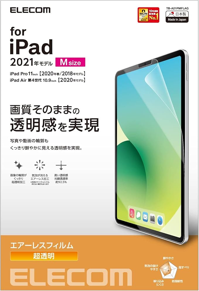 iPad Pro 11インチ (第4世代)(2022年モデル)、iPad Air (第5世代)(2022年モデル)、iPad Pro 11インチ (第3世代)(2021年モデル)、iPad Air (第4世代)(2020年モデル)、iPad Pro 11インチ (第2世代)(2020年モデル)、iPad Pro 11インチ (2018年モデル)の液晶画面を傷や汚れから守る、超透明タイプの液晶保護フィルムです。