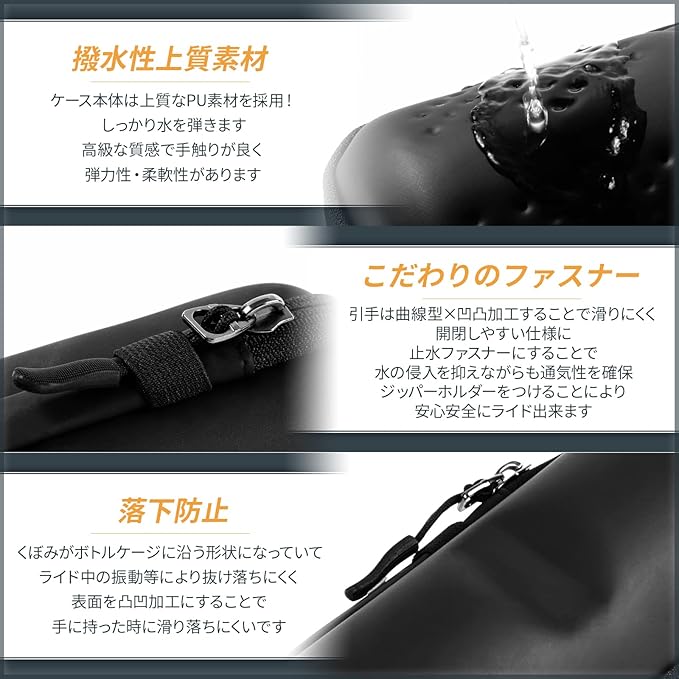 ✅【 ファスナーへのこだわり 】引手は掴みやすい曲線型で表面は滑りにくい凹凸加工なので扱いやすい仕様に、ツールボトルの防水素材に加えファスナーは水の入りにくい止水ファスナーを採用、水の侵入を抑えながらも通気性を確保することに成功しました。ファスナー止めが付いていてライド中もバタつかなくて余計な音もしないので安心。止水ファスナーを採用していますのでファスナーの開閉はかためです。