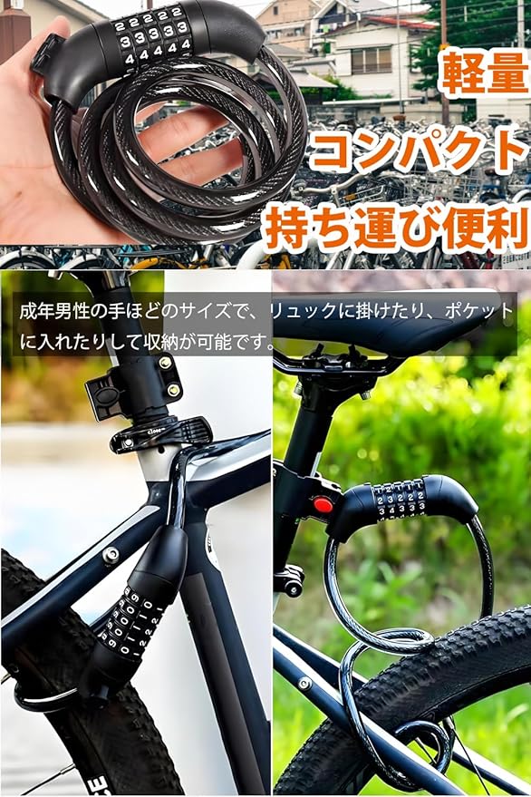 ✅【携帯便利】成年男性の手ほどのサイズで、リュックに掛けたり、ポケットに入れたりして収納が可能です。ダイヤル式のワイヤーロックとなっているため、短時間の駐輪で目を離す際でもお手軽にロックしていただけます。