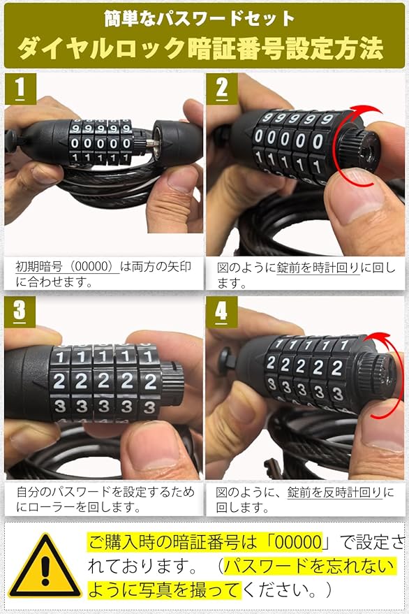 ✅【5桁ダイヤル式のワイヤーロック】鍵は要らないので鍵忘れや紛失などのトラブルが心配しなくてもいいです。ダイヤル式なので、暗証番号を好きな番号に簡単に変更できます。(ご購入時の暗証番号は「00000」で設定されております。)。(注意:パスワードを忘れないように写真を撮ってください。)