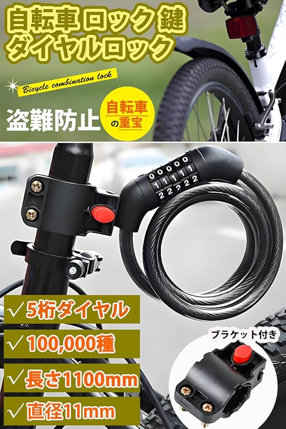 ✅【自転車固定式ロック製品仕様】5桁ダイヤル式のワイヤーロック。長さ:110cm 3cm ワイヤー直径:Φ11mm。重量:約240g。日本語取扱説明書、取り付け用ブラケット付属。