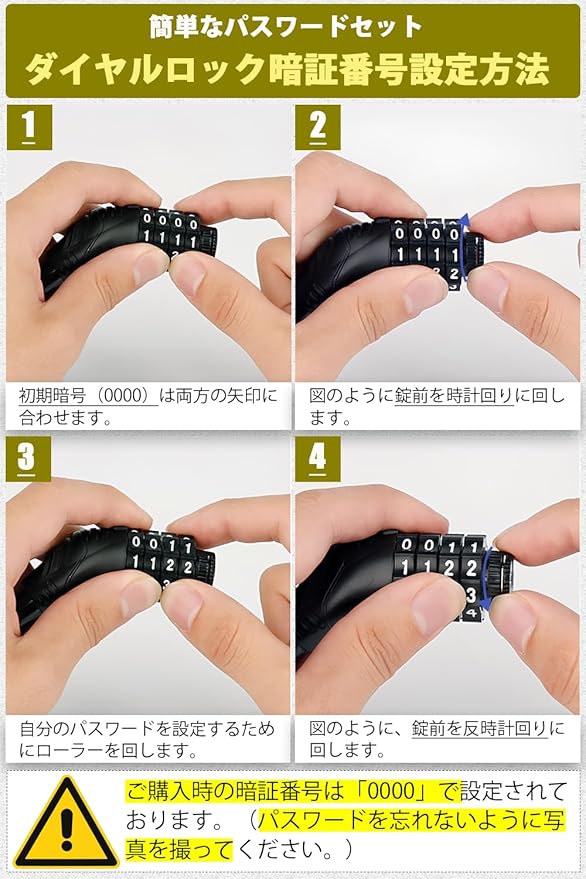 ✅【簡単なパスワードセット】①数字の周りには凹凸の設計感があり、一斉に調節させ、最初のパスワードは0000です。②最初のパスワード「0000」を維持したままで、時計回りに錠前を回します。③新しいパスワードをセットした後、逆方向で「SET」を回してください。④これで、新しいパスワードが設定されました。