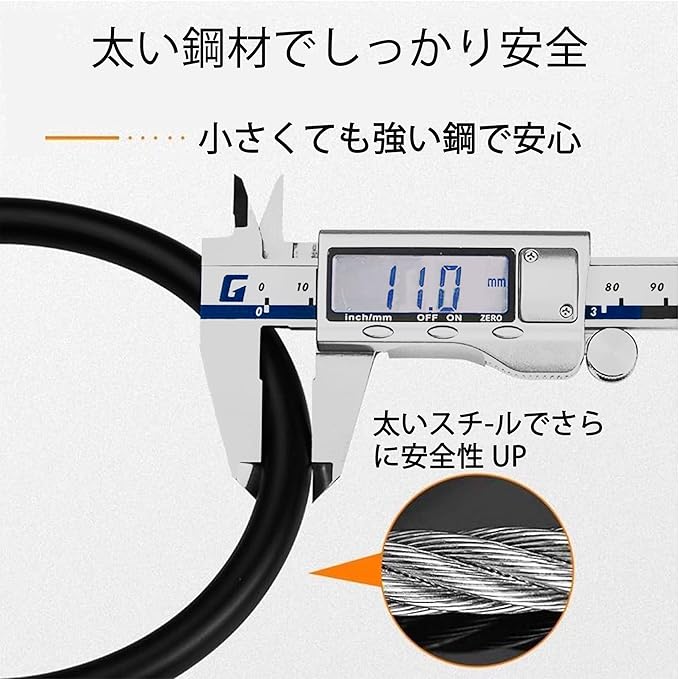 全長約44cm、ワイヤー直径はΦ11mm、重量はわずか約100gと、軽量かつコンパクトな設計で、日常の携帯にも便利です。 暗証番号の変更も非常に簡単で、短時間でスムーズに設定が可能です。太めの高強度スチールワイヤーを採用しており、急な引っ張りや切断への耐性にも優れています。これにより、大切な自転車をしっかりと守り、高い防犯性能を実現します。日常の移動からアウトドアシーンまで、幅広く安心してご使用いただけます。