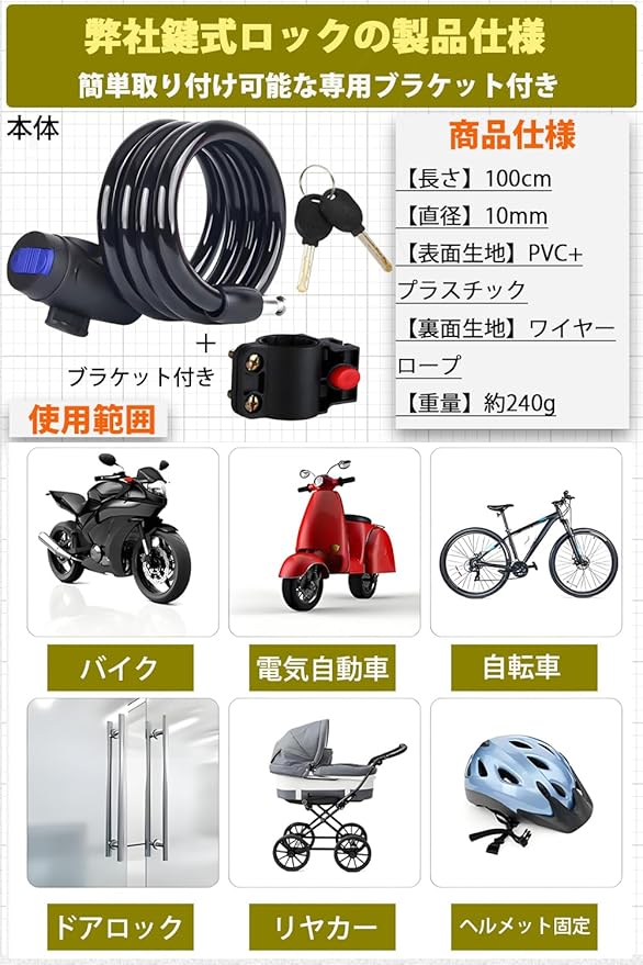 ✅【防犯性能を追求した高切断耐性】特殊スチールワイヤーに独自の熱処理加工を施し、ボルトカッターやニッパーへの耐性を強化。第三者による不正切断を防ぐ防犯基準認証対応構造で、大切な乗り物をしっかりガード。
