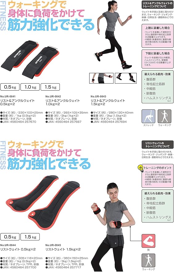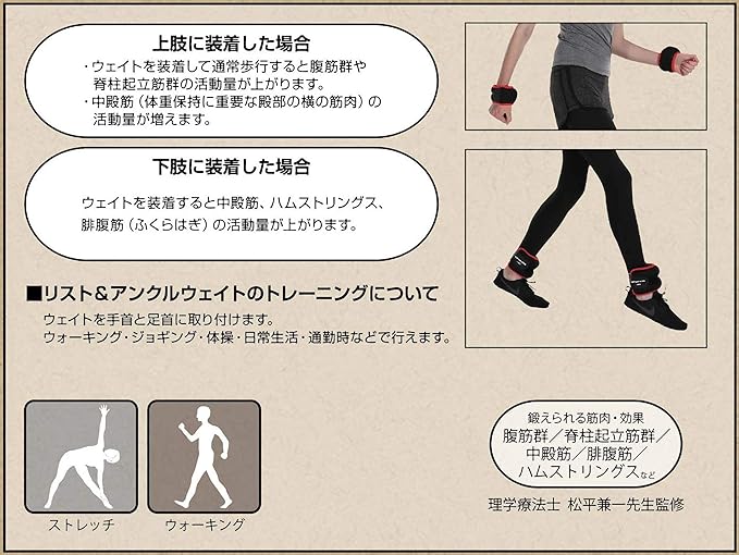 ウエイトを装着して通常歩行をすると腹筋群や脊柱起立筋群の活動量が上がります。