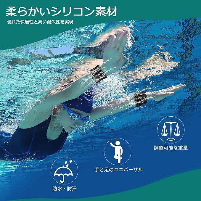④【耐久性、防水・防汗で水中運動にも】水に強い素材を使用しているため、皿洗いやお風呂掃除、水泳・アクアフィットネスにも対応。日常の中で手軽にカロリーを消費できます。一年中使えるトレーニングギアとして人気。耐久性に優れた素材で、長く安心してご使用いただけます。