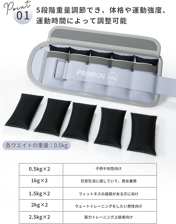【トレーニング段階に合わせて重量調節可能】0.5kg~2.5kg対応: 0.5kg(砂袋1個):日常の歩行や階段昇降に最適。筋肉を軽く活性化。 1.5kg(砂袋3個):フィットネスや縄跳びで負荷アップ。 2.5kg(砂袋5個):スクワットや爆発力トレーニング向け。