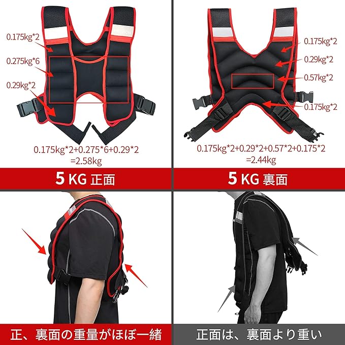 【均等な負荷に耐えやすい】ウェイトジャケットの前後の重量が同じで、負荷を均等に分散させることができます。 歩いたり走ったりして負荷を増やすと、全身に均等に負荷をかけることができます。 サンドバッグは密封されたプラスチックバッグに包まれているため、中身が漏れにくい