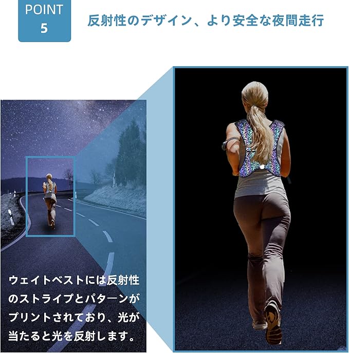 【反射デザイン】ベストの表面に反射模様がプリントされており、照射後の色が鮮やかになり、夜のランニングがより安全になります。
