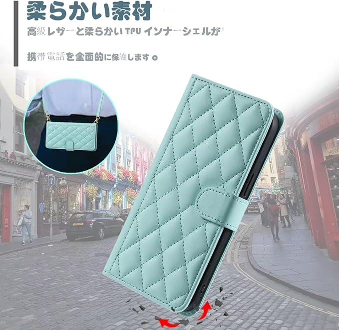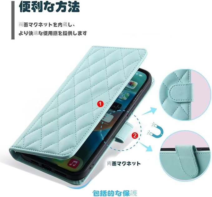 【高品質素材及び設計】大切なスマホを守る安心の手帳型。内部は衝撃吸収性に優れたTPU素材を採用して、落下時の衝撃を効率よく吸収するようにケース の各コーナー内側が設計されています。手触りが良く、キルティングの設計は控えめでエレガントです。