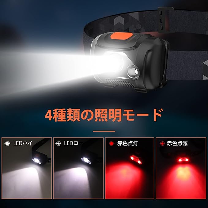 【4つの点灯モード&SOS点滅】ヘッドライトは4つの照明モードがあり、使用状況に応じて調整可能、片手でも簡単に切り替えます。白色ライト:強➡弱; 赤色ライト:赤色点灯➡赤色点滅モード。(赤色LEDライトで魚は警戒する事なく釣れます。雨・霧などの悪天候でも視認性が良く、遠くからでも確認しやすくなり、事故防止に役立ちます。)