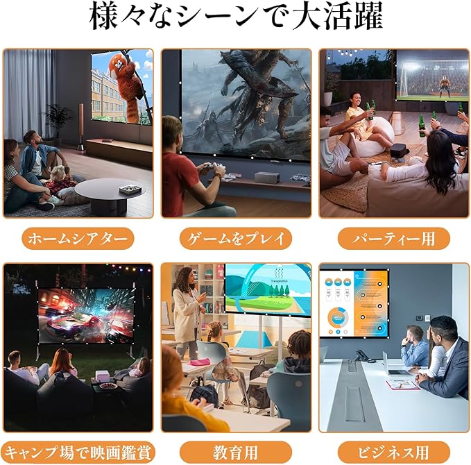 【100インチスクリーン】対角線サイズ:100インチ、スクリーンサイズ:225cm 128cm、高アスペクト比:16:9、6-10畳の部屋に適しています。100インチの大画面と高アスペクト比で、迫力のある映画やゲームをホームシアタースクリーンで楽しむことができます。