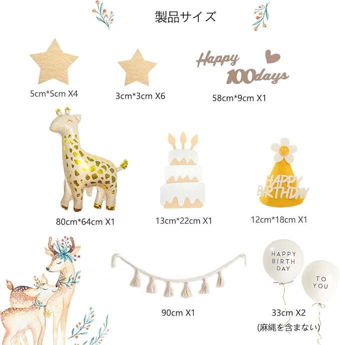 【華やかなハッピーバースデーの装飾セット】 happy birthdayフェルト生地バナーx1、ケ-キ飾り*1個、星*9個、キリン バルーンx1、ケーキトッパーx1、90cmタッセルタペストリーx1、バルーンx2などが含まれています。