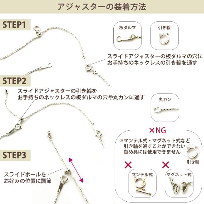 SV925 シルバー925 スライドアジャスターはシリコンの入ったスライドボールを動かすことにより無段階で長さ調節が可能。お手持ちのシルバーカラーのネックレスやブレスレット、アンクレットなどに手軽に長さを足すことができます。 【5cm/10cm/15cmアジャスター】短くなってしまったネックレスの長さ足しに。 【20cm/30cmアジャスター】お気に入りのショートネックレスにプラスしてミドルorロングネックレスとして楽しむこともできます。