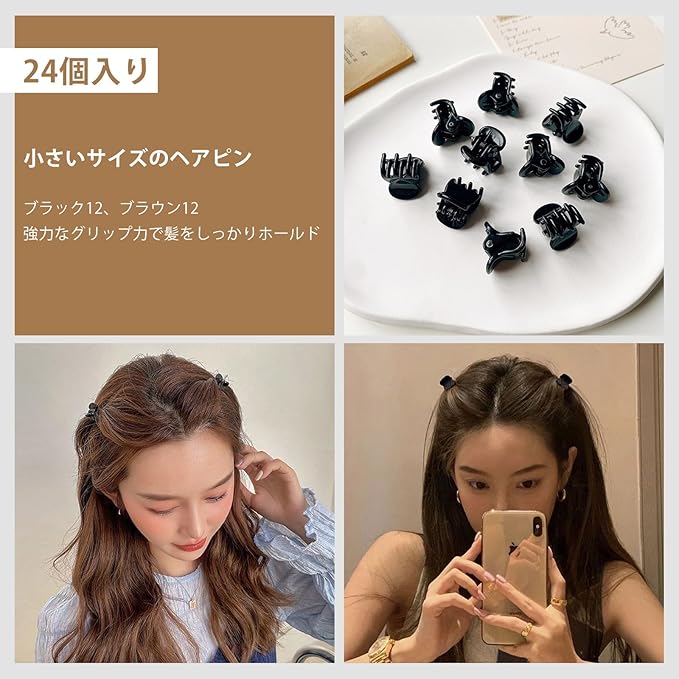 ✨【厳選された素材】ミニヘアクリップは高品質で耐久性のあるプラスチック素材で作られており、軽量で持ち運びやすいだけでなく、靭性に優れ、壊れにくく、長寿命を保証します。 ✨【スマートなデザイン】ヘアクリップのサイズは1.5cm*1.5cmと慎重に設計されており、コンパクトで実用的で、小さいながらも強力なグリップ力があり、髪をしっかりとクランプし、ヘアスタイルを維持できます。安定感があり、ファッショナブルなスタイルがすぐに完成します。 ✨【2色】2色のヘアクリップを提供し、さまざまなヘアスタイルにマッチするだけでなく、簡単にあなたの個性を示し、全体的な外観にさらにハイライトを追加できます。 ✨【多機能応用】前髪を整えたり、後れ毛を整えたりするのに適しているだけでなく、洗顔やメイクの時にヘアアクセサリーとしても使えて、便利で実用的です。 仕事、勉強、旅行など、毎日のヘアアクセサリーに最適です。 ✨【パッケージ内容】黒いヘアピン12個と茶色のヘアピン12個を含む、合計24個。 絶妙な製造技術により、ヘアピンの安定性が確保され、変形しにくく、ユーザーに快適な着用体験を提供します。