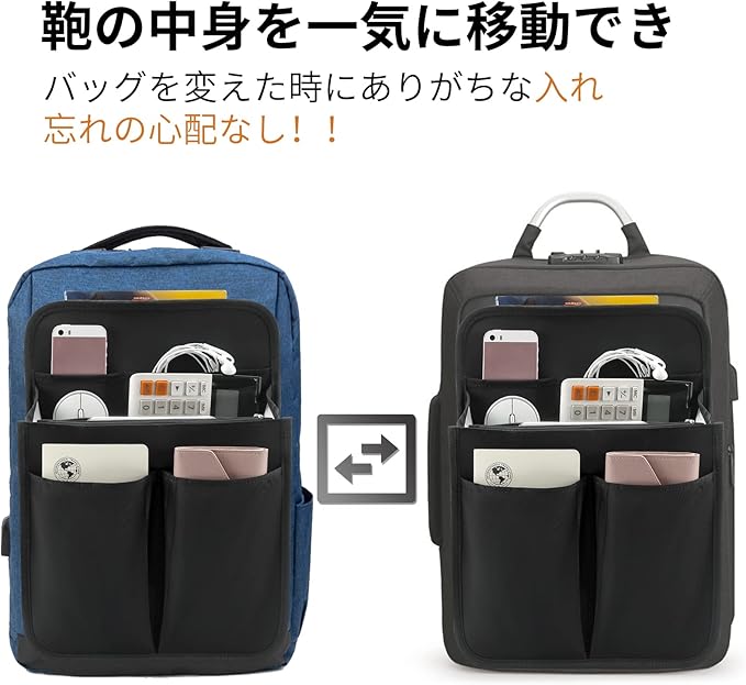 【超軽量】バックインバックは自立している分、多少に重さが感じますが、持ち運びなら気にならない程度です。リュックの重さをそれほど変わらないので持ち運びにも苦労しません。バッグからバッグへの入り替える簡単で、ママバッグとしても便利です。【側/後ろにチャックあるリュック】側に日常小物を入れるポケット6つあり。口金リュックの両側スペースにも機能させるし、側/裏にチャックが付いたリュックの中身出し入れもやすくなります。通勤通学、海外旅行など、途中で使う小物が多い場合に適しています。