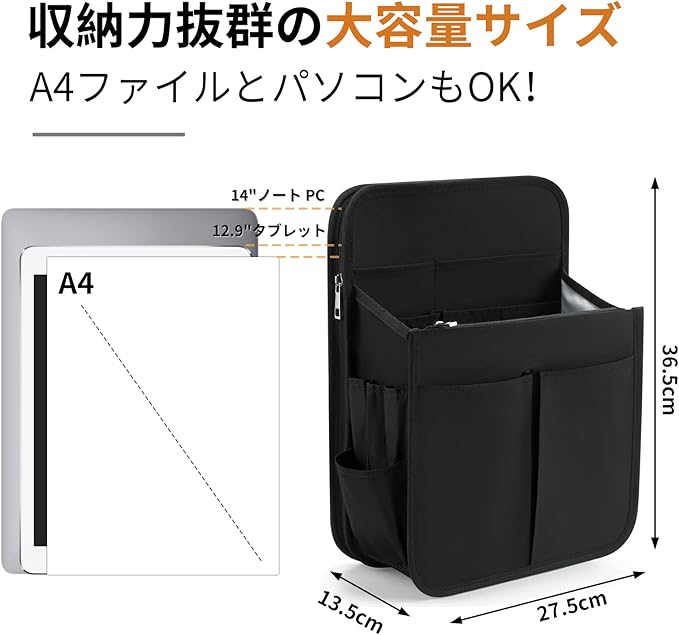 【特に事務用品対応】全てのビジネス用品をちゃんと収めるためポケットの寸法を決められます。クリアファイル、A4書類、13.3インチPC、マウス、ペン、電卓や厚い充電器、A5サイズのレシート、または長さ別々になるケーブルなど、それぞれ定席に入れられます。