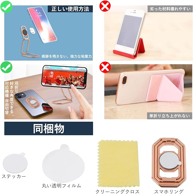 【プレミアム素材】スマホグリップは高品質の亜鉛合金金属素材でできており、耐久性に優れ、長期間使用してもフレッシュで色のない状態を保つことができます。 強力で非常に粘着性のあるテープでスマートフォン(重力5kgでテスト済み)にしっかりと密着し、偶発的な落下や滑りからデバイスを保護します。