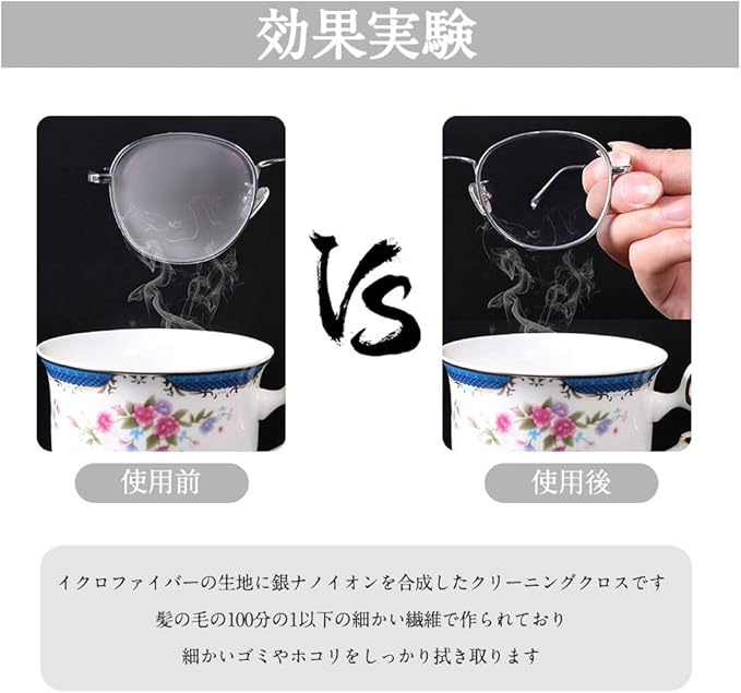 2.素材構成:イクロファイバーの生地に銀ナノイオンを合成したクリーニングクロスです。髪の毛の100分の1以下の細かい繊維で作られており、細かいゴミやホコリをしっかり拭き取ります。