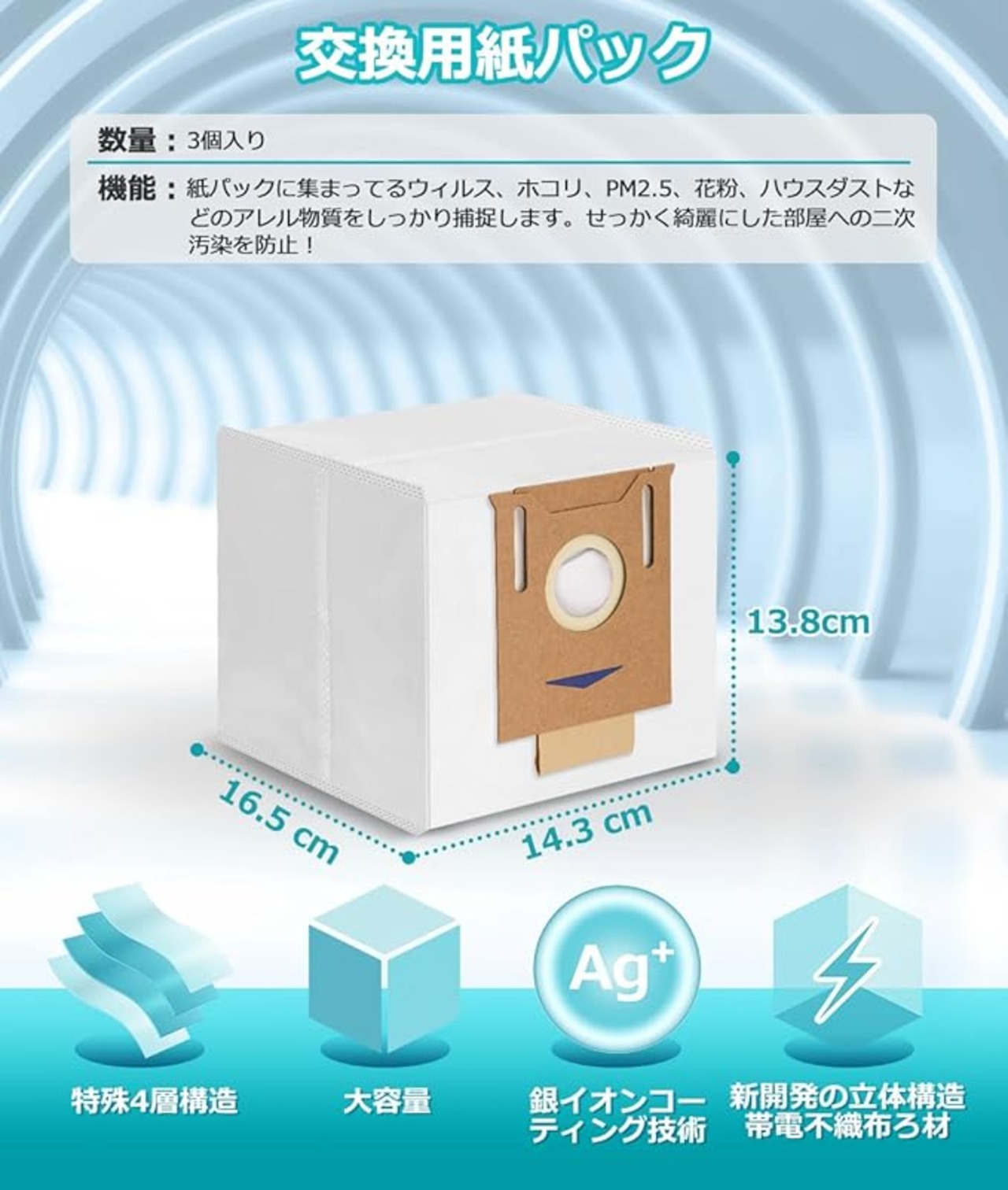 【パッケージ内容】 ロボット掃除機 用 ダストフィルター 3、紙パック 3、サイドブラシ 3セット、メインブラシ 1、お手入れ用ブラシ 1個、日本語取扱説明書 1