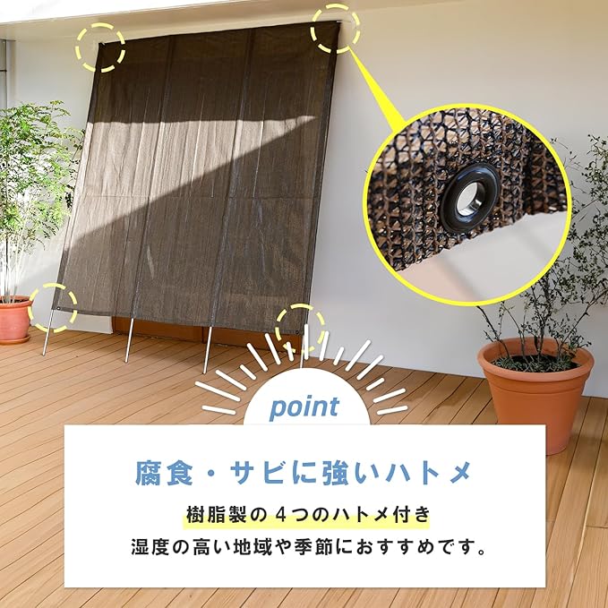 風の強い日はご使用せず、取り外してください。錆びない樹脂製ハトメ。
