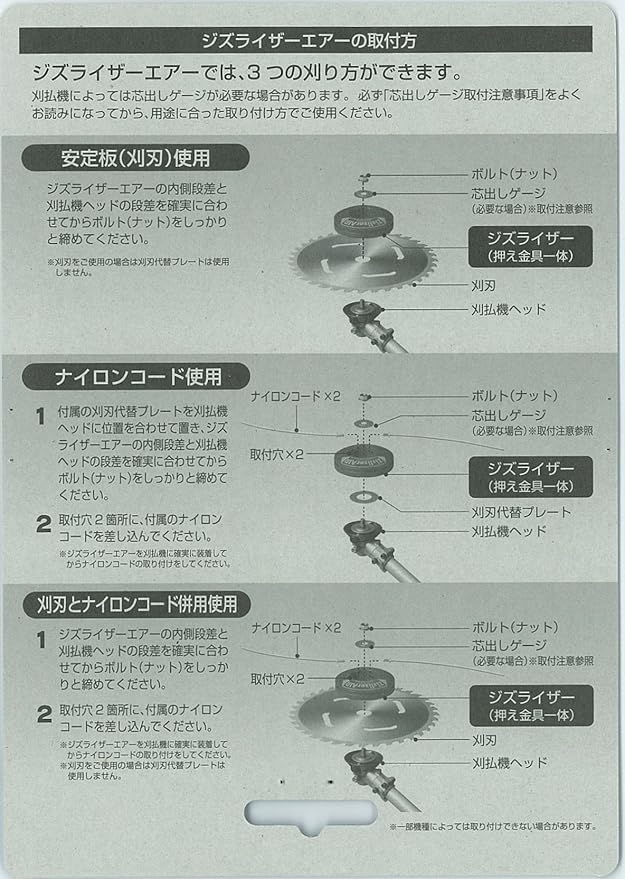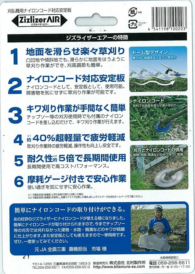 ●刈払機用安定板で地面を滑らせて草刈りできます。●用途・場所に応じて、刈刃用安定板・ナイロンカッター・刈刃とナイロンカッター併用の3つの刈り方から選ぶことができます。●安定板とナイロンコードどちらも使いたい人におすすめです。●従来の金属製安定板と比べ軽量で、独自の構造設計と厳選された材質で高い耐久性があります。●地ズリ作業に適したドーム型形状で草刈り作業の疲労軽減と操作性が向上し高齢者にもやさしい設計です。●長期使用ができ、経済的にも優れているのでヘビーユーザーの方にも嬉しい性能です。●交換時期をお知らせする摩耗ゲージがついています。●クッション構造により、地ズリ面との衝突によるバウンドの危険性を抑制して作業者と周囲の安全性を確保します。