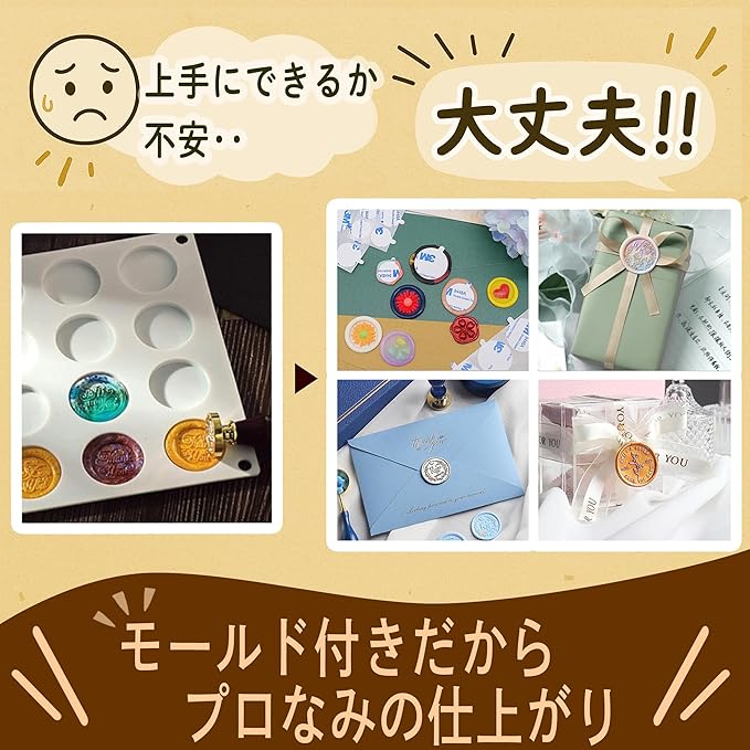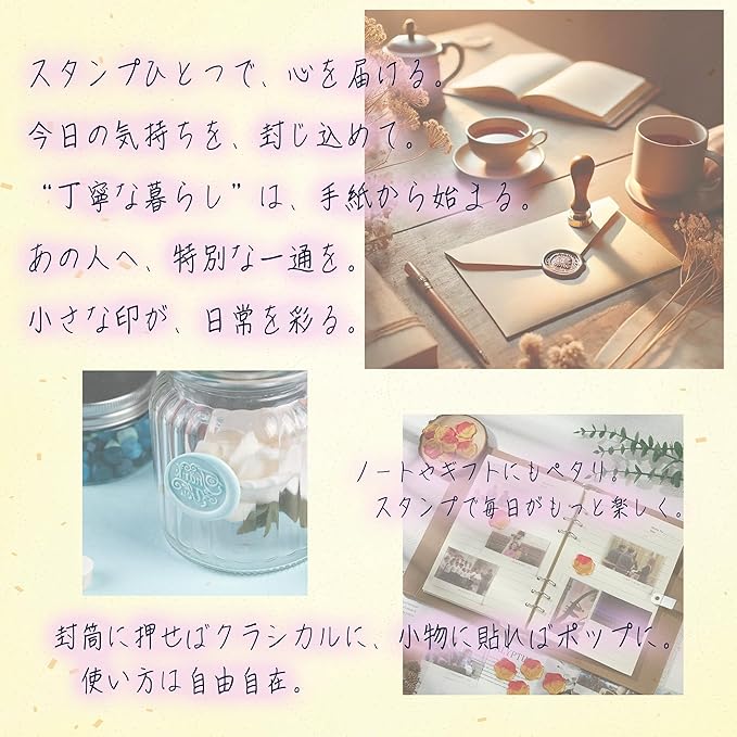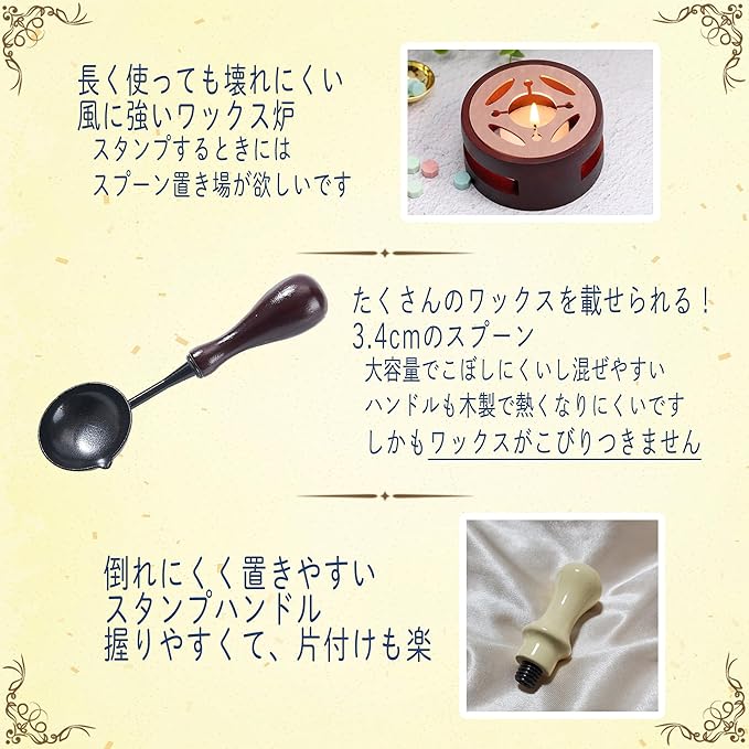 【初心者でも安心!届いたその日から始められるシーリングスタンプセット】 シーリングスタンプとワックスがセットになっており、初めての方でも簡単に使用できます。届いたその日からシーリングスタンプの魅力を楽しめます。
