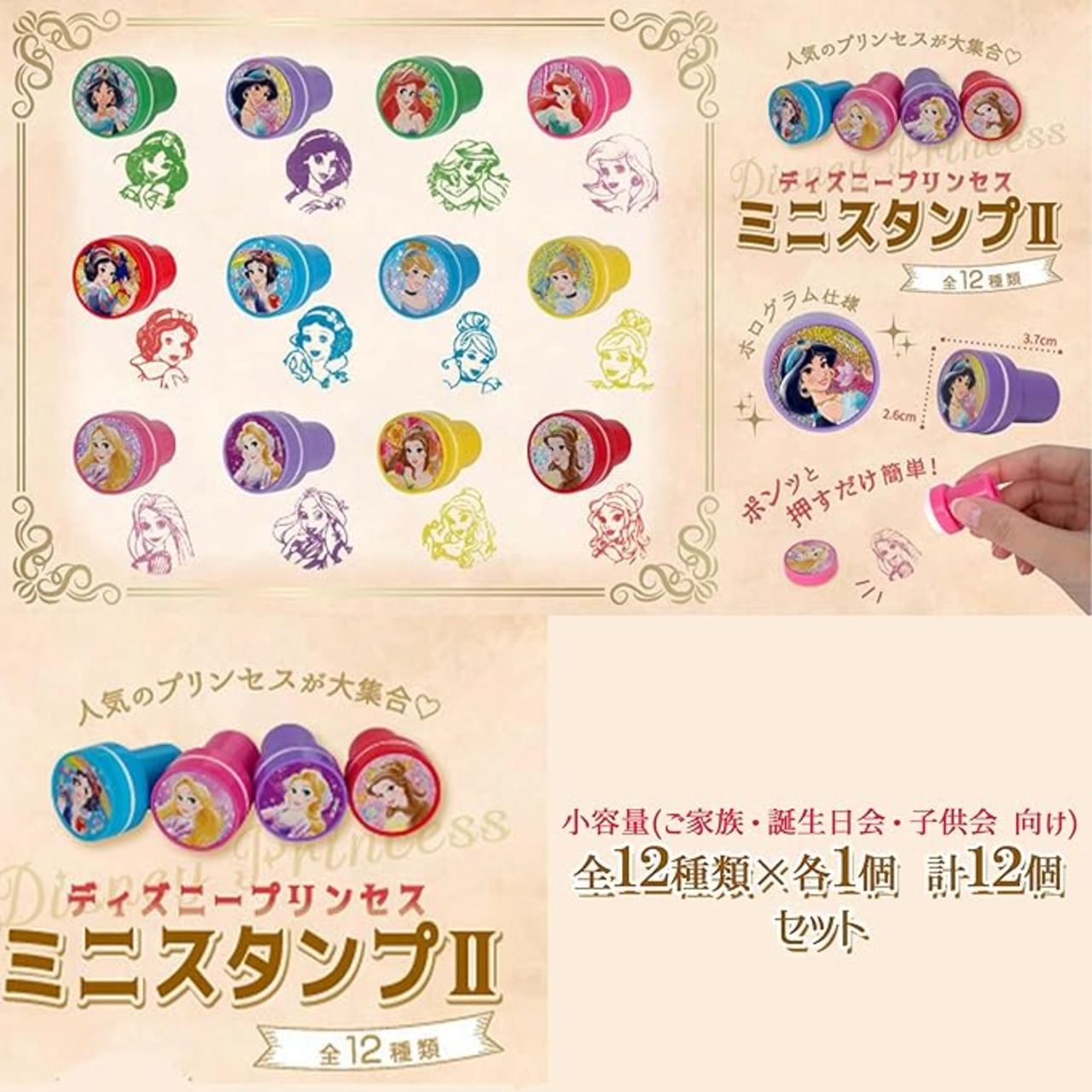 三洋堂 プリンセス のカラフル 丸型 ミニスタンプ 全12種 各1個 計12個セットをお届けします。( 小容量 ご自宅 お誕生日会 お楽しみ会 向け)デ ィ ズ ニ ー プリンセスのかわいいスタンプが出来ました!プリンセスのキラキラした表情が良いです! インク入りですので片手でポンッと押すだけです!みなさまでお楽しみください!手帳 ノート 落書き帳 などどこにでも押せます。 各 スタンプ によってインク カラーも違うためカラフルになりますよ!幼稚園 保育所 幼児施設 の チェックスタンプ としてもお使いいただけます。または、イベントで スタンプラリー などでお使いいただけるかも!全12種類セットです。 ご自宅でお使いいただくにはピッタリな量です。また、お誕生日会 子供会 お楽しみ会 などイベントでの 景品 プチ プレゼント としても お子様に喜んでいただけます。スタンプサイズ W2.6 H2.6 D3.7cm