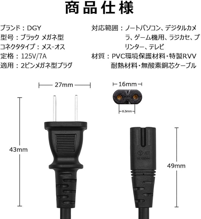 DGY 1.5M AC電源ケーブル メガネ型コネクター・プラグ 電源コード 2P・ストレートコネクタ 電源コード 2ピンプラグ(オス)⇔2ピンソケット(メス) ストレートタイプ ノートパソコンアダプター ACコンセント | etshop