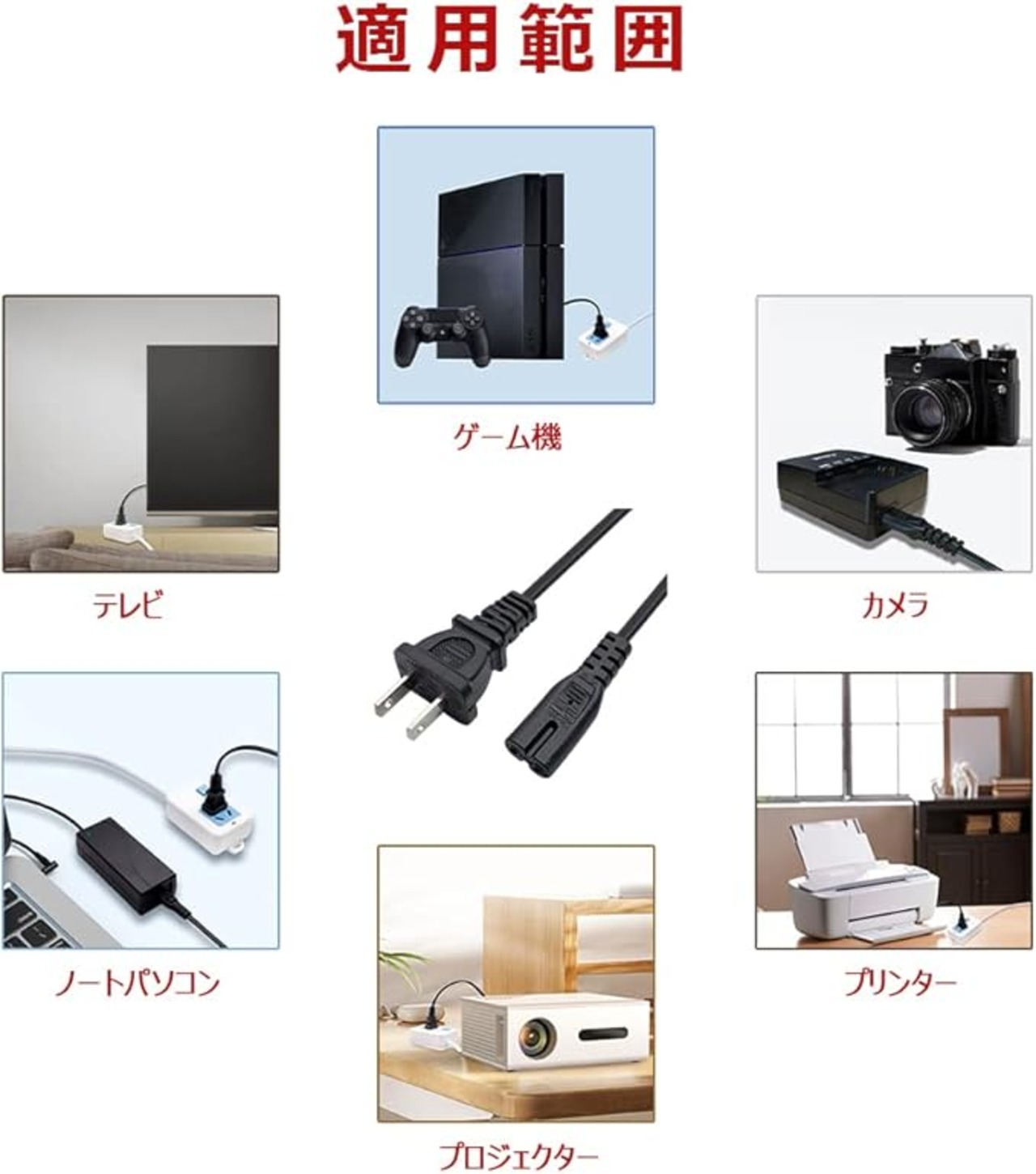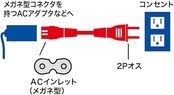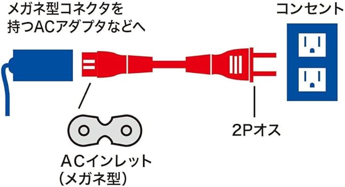 対応範囲:2ピンメガネ型プラグのノートパソコン、デジタルカメラ、ゲーム機用、ラジカセ、プリンター、テレビなどに適用します。