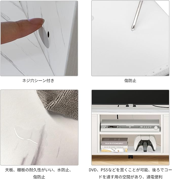 【安全構造】全体で耐荷重は100kg、天板に人が座っても大丈夫です。そして、ストッパーキャスターが搭載しているため(センターで1個キャスターもあり、全部で5個キャスター)、耐震性と転倒防止機能を兼ね備えた安定設計です。木製部分は樹脂を浸透させた紙を積層させた耐久性の高いメラミン化粧板です。熱・傷・汚れに強いテレビ台です。汚れても清潔しやすくてお手入れが簡単です。耐摩耗性・防水性・耐熱性に優れています。
