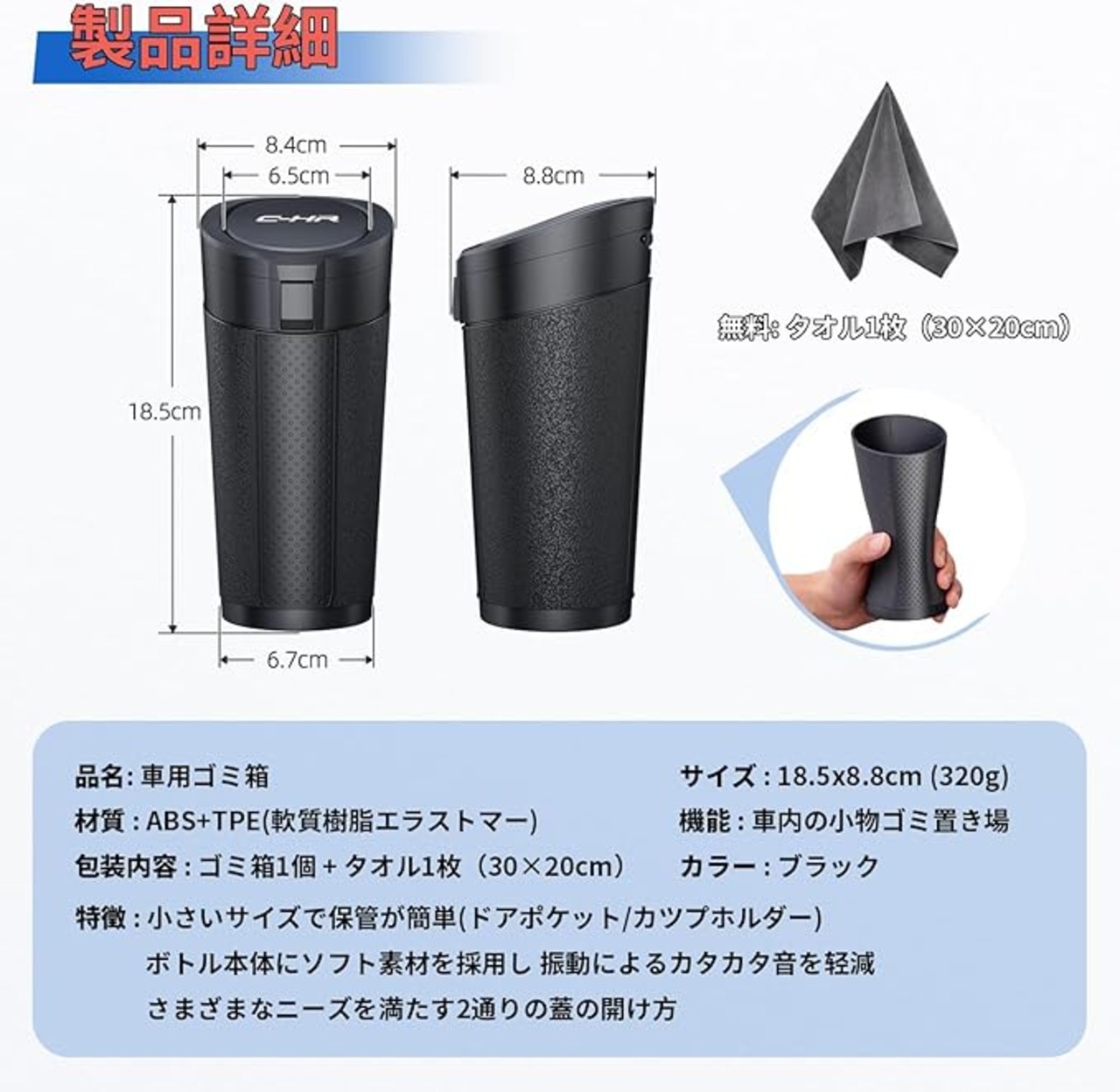 C-HR 車用ゴミ箱 スリム ボトル型 ソフトゴミ箱 蓋を開ける2つの方法、chr カスタム アクセサリー 内装パーツ、小物入れ おしゃれ ゴミ箱 車載 車内便利 カー用品 +洗車タオル1枚 (ブラック, C-HR 専用) | etshop