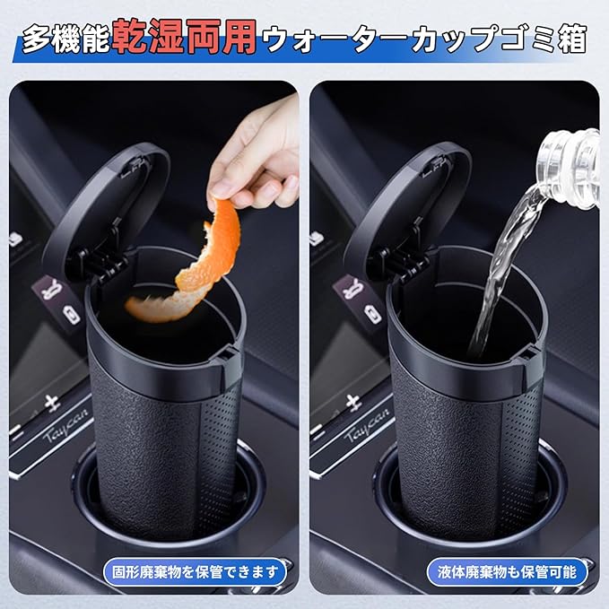 【乾湿ゴミを同時に収納できる・車内をすっきり・実用性抜群】この車用ゴミ箱は、車内のさまざまな小さなゴミを簡単に片付けることができます。ティッシュや果物の皮、お菓子の包装などの乾いたゴミだけでなく、少量の液体ゴミも漏れずに収納可能です。スリムなデザインは見た目も美しく、車内の便利グッズとして、愛車の内装を快適で清潔に保つことができます。