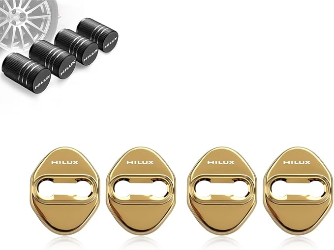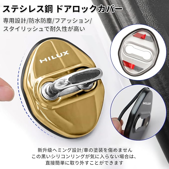 ハイラックス 専用 アクセサリー ドアストライカーカバー ドアロックカバー HILUX カスタムパーツ ハイラックスgun125 パーツ内装 高級鏡面ステンレス製 独創 改良式 ドア保護 4個セット, 贈り物: タイヤ バルブキャップ (ゴールド)