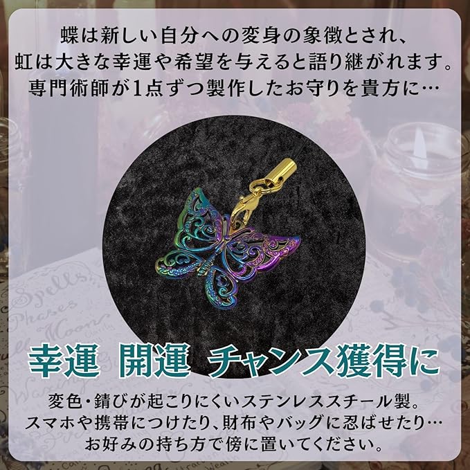 大幸運に恵まれ人生好転のチャンスを得られるよう祈願した西洋魔術の強力なお守りです。蝶は新しい自分への変身の象徴とされ、虹色は大きな幸運や希望を与えると語り継がれます。