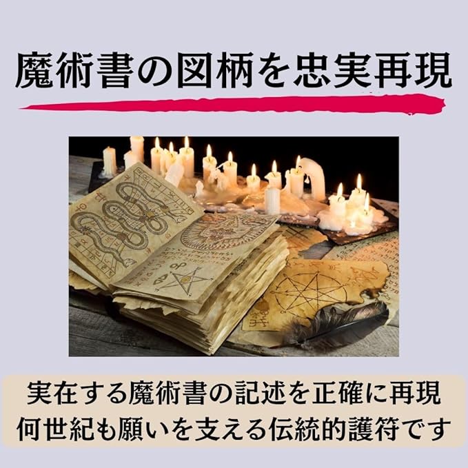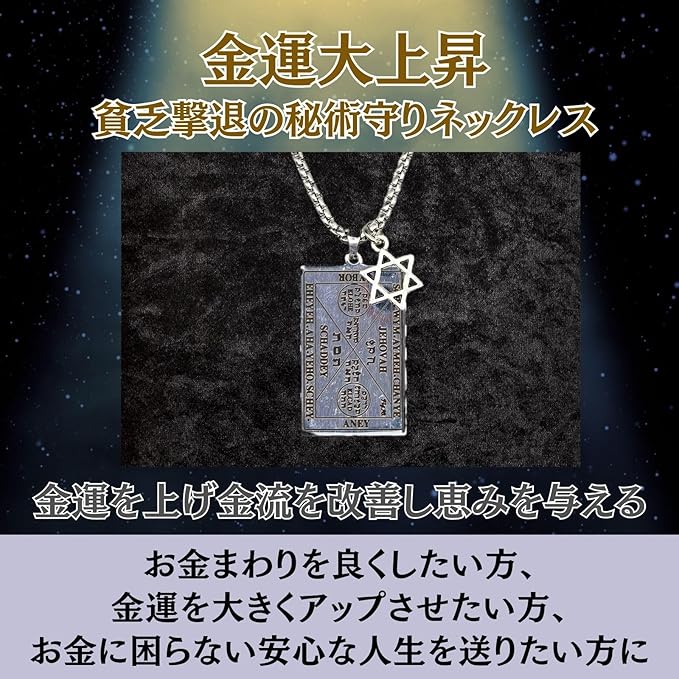 持ち主の金運を大きく上げて金流を改善し豊かな日々を与えるよう祈願した西洋魔術の強力なお守りネックレスです。魔術書「モーセ第七の書」に記された第1の印章の護符の図柄は天から授かった秘術とされます。六芒星はダビデの星とも呼ばれ、邪を退け調和と安定を与えるパワーを放つと言われます。