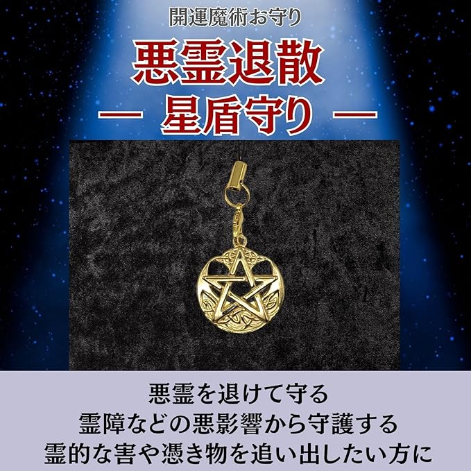悪霊の害や霊障を祓うよう祈願した西洋魔術の強力なお守りです。五芒星は魔術において悪魔・悪霊ほか悪しき存在を寄せ付けない最強の魔除けとされています。