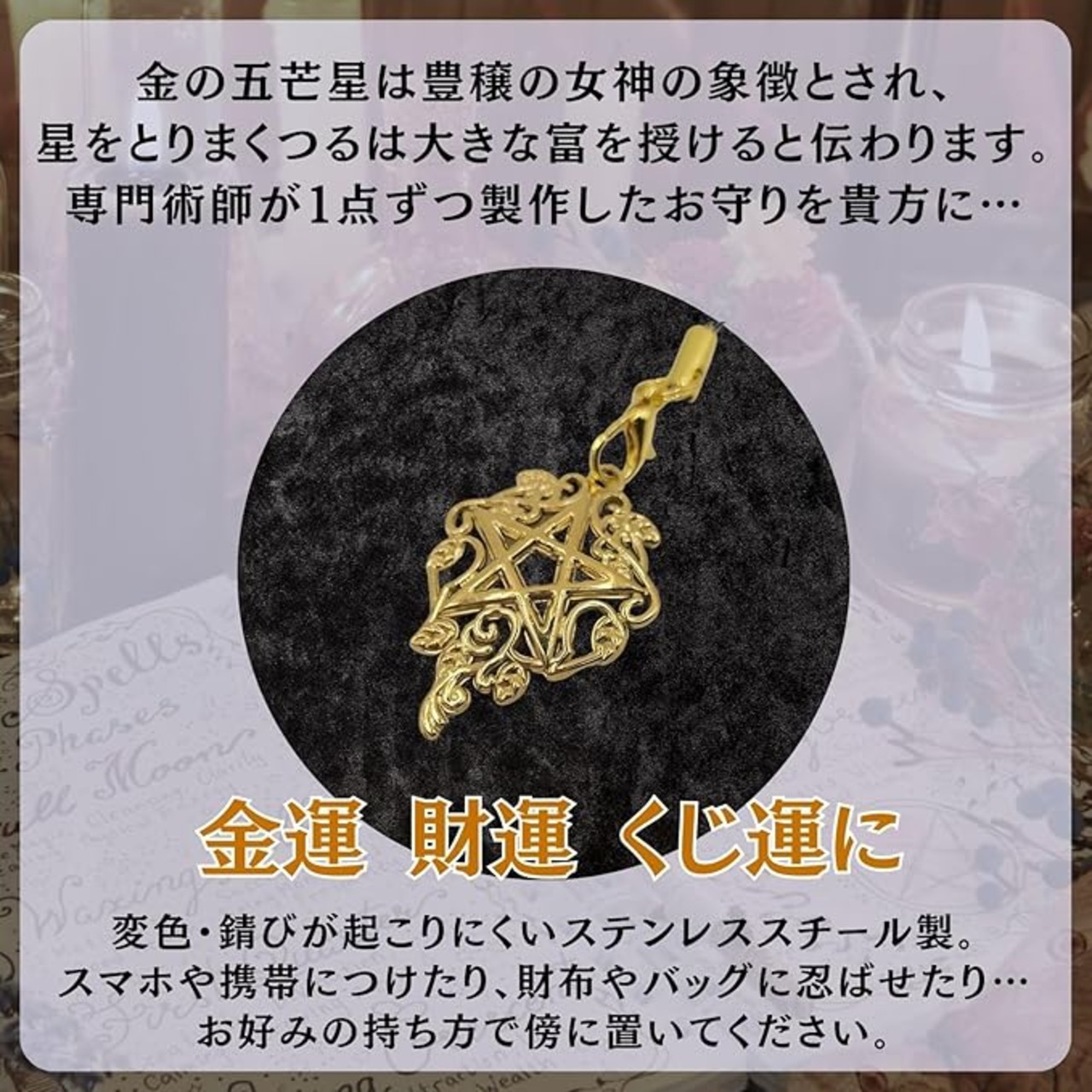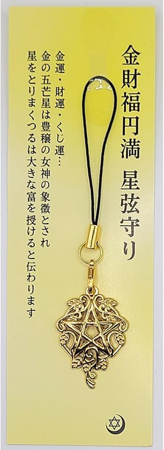 金運・財運・くじ運に恵まれ大きな富を絶え間なく得られる得られるよう祈願した西洋魔術の強力なお守りです。金の五芒星は豊穣の女神の象徴とされ、星をとりまくつるは大きな富を授けると伝わります。
