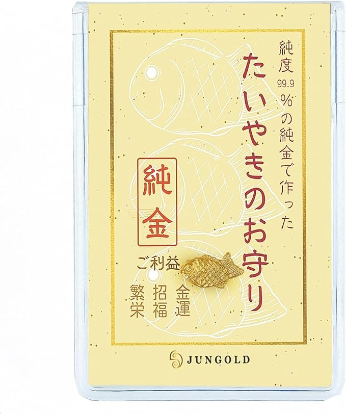 純金の「たいやき」焼けちゃいました!! 価値ある本物素材で作った【黄金のたいやき】 「純金のたい焼き」って? 見た目はかわいい“たい焼き”でも、 中身は本物の純金(24K)。 JUNGOLDの中でも、人気No.1クラスのロングセラー商品です! ・ 素材:純度99.9%の高品質な金「純金」 ・ デザイン:縁起の良い「たい焼き」モチーフ ・重さ:約1g(製造工程上、 10%の誤差が生じる場合があります) ・仕上げ:「ナチュラル仕上げ」により、純金の美しい輝きを最大限に引き出しています。 ・ 付属品:専用のお守りケース付き