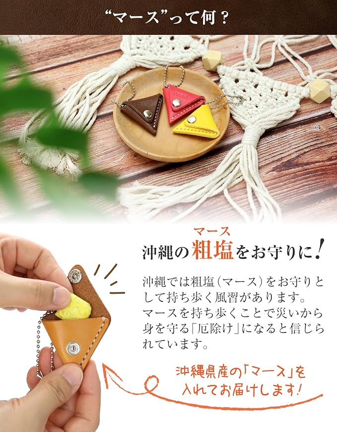 【伝統】沖縄では塩をお守りとして持ち歩く習慣があります。CORTEEでは携帯お守り入れとして、ミニさんかく型のレザーケースの中に沖縄の塩を入れお守りとして制作いたしました。
