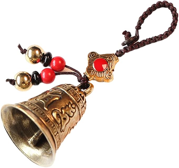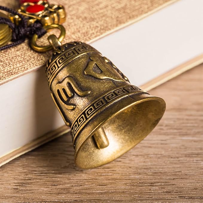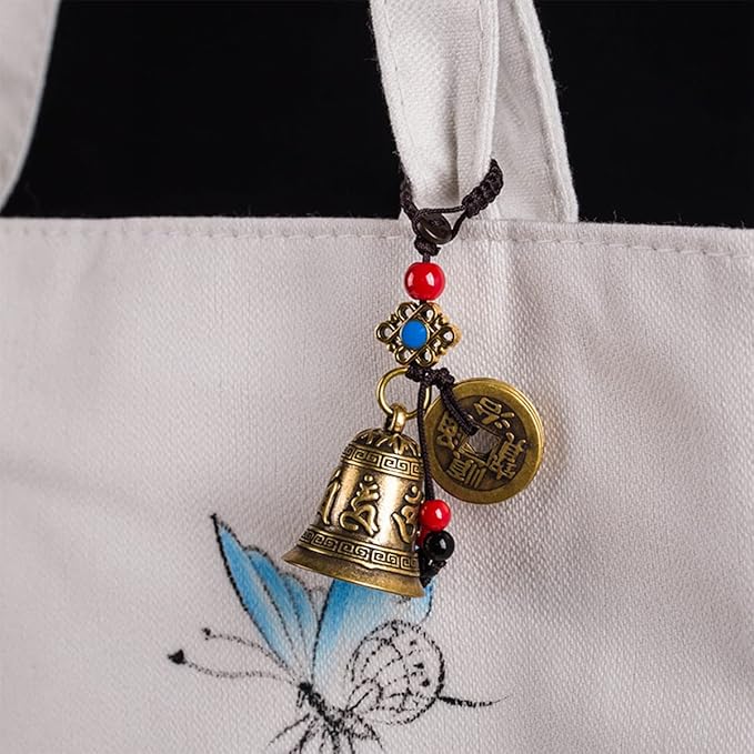 サイズ:直経29mm、高34mm、紐含む長さ85mm,2つのスタイル:六字真言銅鈴, 六字真言銅鈴+五帝錢