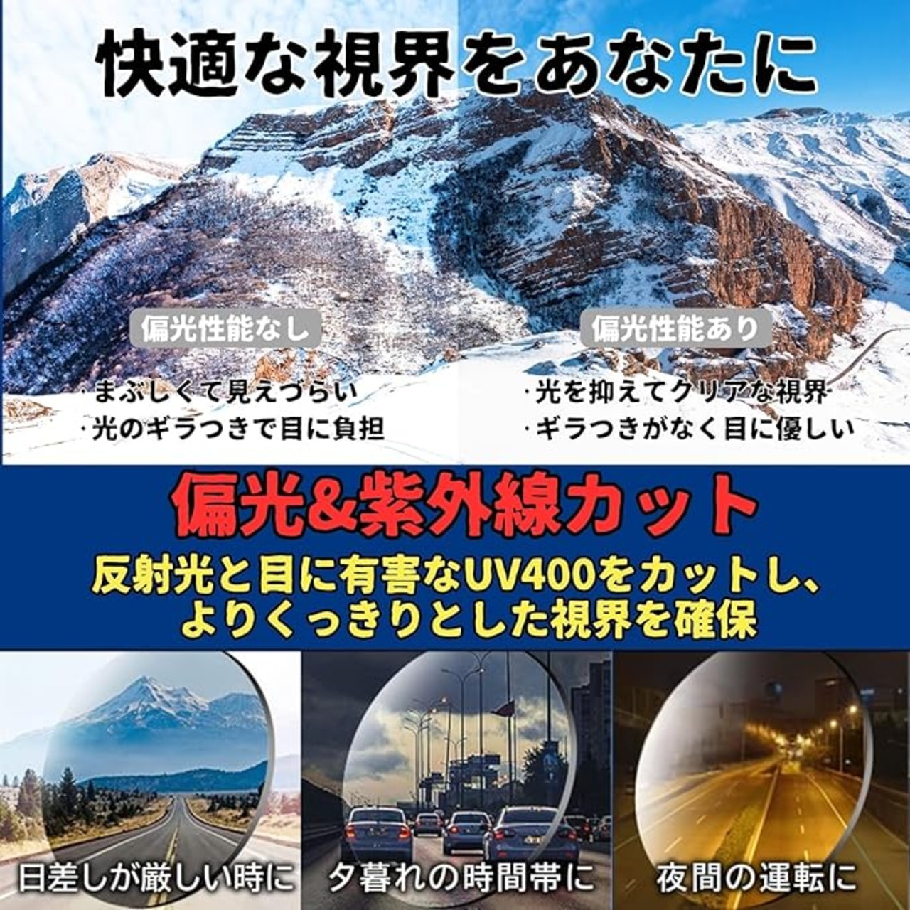 【幅広いシーンに活躍】ドライブ、釣り、ランニング、キャンプ、旅行など、アウトドアから日常までさまざまなシーンで活用可能。特に眩しさを感じやすい夏や雪道での運転に効果を発揮します。