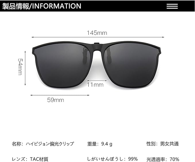 【製品仕様】 品類: サングラスクリップ 性別:男女共通 レンズ性能:変色調光レンズ、偏光uvカット 紫外線カット レンズ材質:TAC偏光レンズ フレーム材質:超軽量合金 ノーズパッド (鼻当て) 材質:シリカゲル 製品重さ:9g 紫外線カッ:99% 。