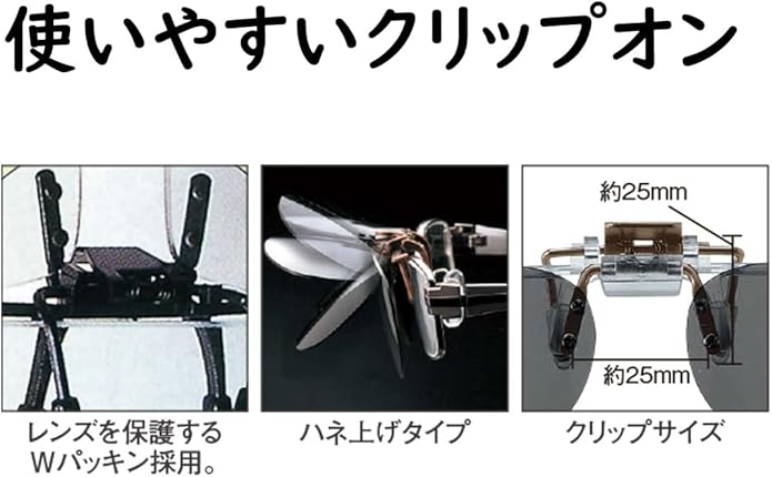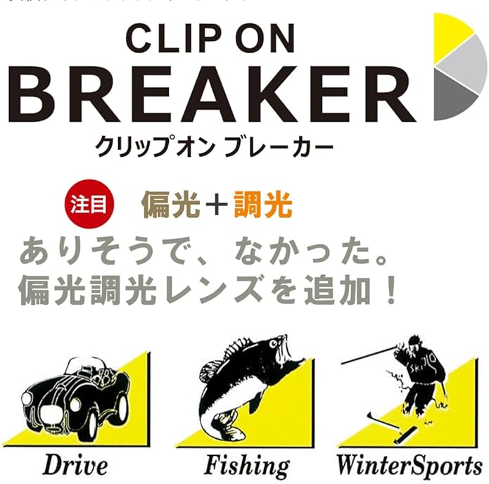 偏光機能・調光レンズのクリップオンサングラスです。メガネに挟むだけでサングラスに早変わり。使用しない時ははねあげられます。紫外線が当たるとイエローからグレーへ変化します。