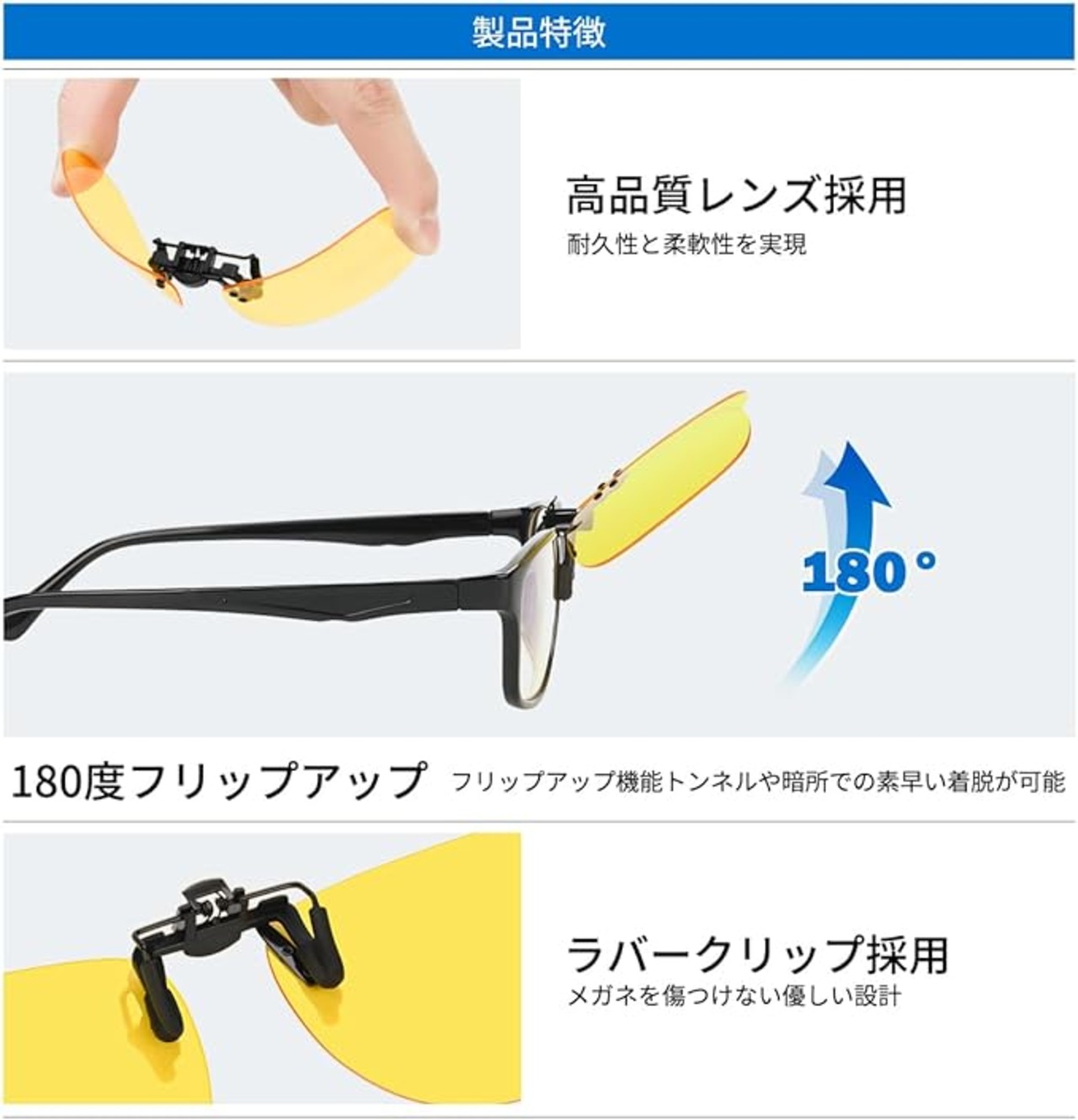 抜群の汎用性:わずか8.9gの超軽量設計で、長時間使用でも負担を感じません。幅131mm以下、高さ51mm以下のメガネに対応する広い互換性で、運転やアウトドア、日常使いまで幅広いシーンで活躍