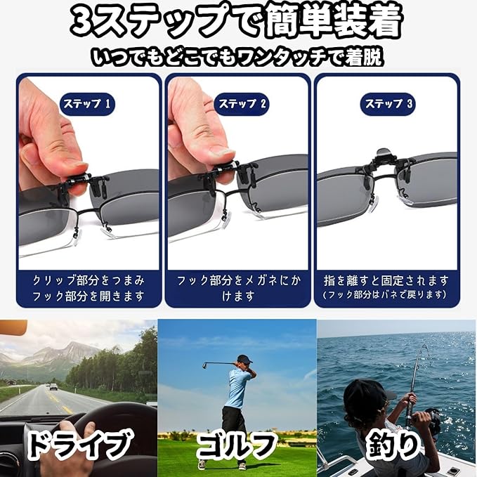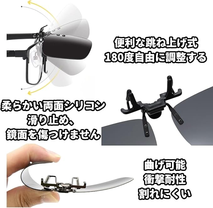 【クリップオン式で簡単装着】先進的なクリップオンデザインにより、既存の眼鏡に簡単かつ迅速に取り付け可能です。跳ね上げ式機能により、サングラスを使用したい時だけ下ろして使用し、必要ない時は上げておくことができます。この便利なメカニズムは、アクティビティ中でも素早い視界の調整を可能にします。