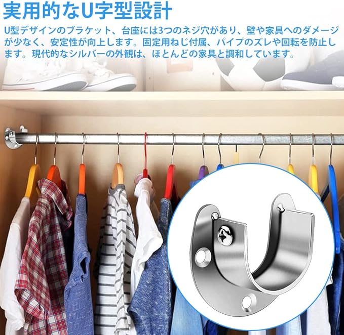 ↪【多機能なフランジソケット】:U字型フランジソケットは壁や木製の表面にしっかりと固定され、物干し竿やカーテン掛けのポールを固定する金具です。クローゼット、浴室、キッチン、リビング、ランドリー、ベランダなどの場所に適用されています。タオル、衣類、カーテン、ネクタイ等を簡単にぶら下げることができます。