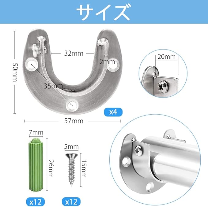 ↪【パッケージ内容】:セットには、クローゼットポールソケット4個、ねじ12個、拡張ネジ12個を含まれております。十分な数量で、部品の組み合わせが揃っておりますので、日常のニーズに満たすことができます。対応パイプのサイズ:32mm;穴径:4.5mm;ブラケットのサイズ:横5.7cm,縦5cm。ご注文前にサイズをチェックしてください。